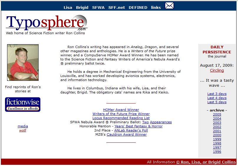 It would be almost a year (July 6, 1997) before I would actually title a piece—a tiny bit about meeting Dr. Demento, one of my weird heroes, at a convention. My next titled piece was in September. That whole year was raw. Very, very raw. Simple entries that primarily tracked submissions. That’s what the place was then, a simple Web Presence before there were more complex Web Presences, a place where I and a few friends could share stuff.