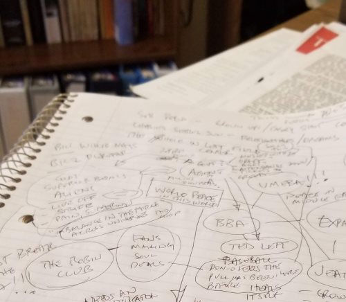For this book, as you can tell, I’m mostly pantsing—writing directly into the dark and letting the story coalesce in my mind as I go. But last night, as I was grilling dinner, I sat down with a notebook and bubbled on the story as I was feeling it. I did this because as I was writing, I was beginning to feel ideas welling up, and I didn’t want to lose them.