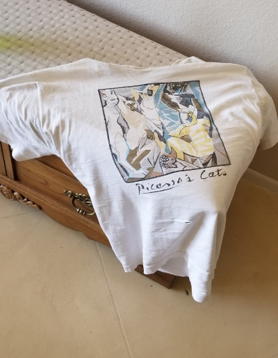 As one does with shirts, I wore it in various locations for several years, including during my first stint in Los Angeles with the Writers of the Future, which is where the shirt’s story takes the turn that resulted in its sentimental value. Short version: I’d been on a quest to write eight stories in the week I was there. I’d finished seven and was dead tired when I came down that last late afternoon to take a break. A person there—who knew I was trying to get eight—asked how it was going. I told him I had seven done, but didn’t think my brain could do another that night. “You should write something quick about that,” he replied, indicating my Picasso’s Cats shirt.