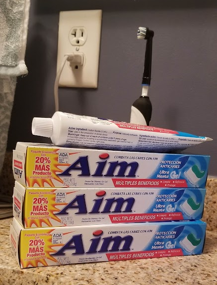 The good news is that literally the evening I posted that, the Aim toothpaste fairy appeared out of nowhere with a whole stack of the preferred product. Oh, I know what you’re thinking? Toothpaste Fairy? Seriously? Well…you can believe what you want, I suppose. But personally, I think Lisa has a close relationship with said toothpaste fairy and made a call in order to save the day.