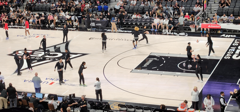 A half hour before every game starts, the Aces (like all teams) head out to the court and have a ten-minute warmup session. When that’s finished, they go back into the locker room for a chat (or whatever?) and return in the last five or so minutes for a quick shoot around. Overall, the process gets them loose and ready to play.