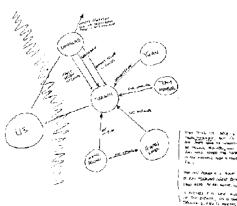 Since my context diagram brought a few comments, I thought I would post an uglified version of it here in hopes that it might help a few others (or at least convince a few folks that I'm not helplessly insane). The center bubble is the main character. The other bubbles are things and people that are directly affecting the main character. The lines connecting them (and their markings) are the problems those actors are creating, and therefore are the main character's chief motivators at that time of the story. The big squiggly line is a physical separator for the antagonists.
