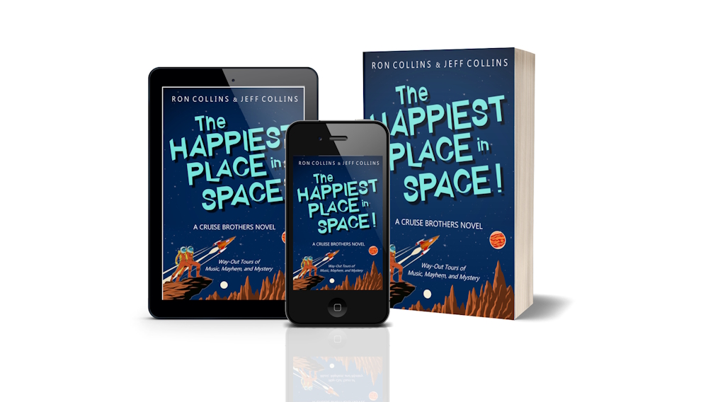 THE HAPPIEST PLACE IN SPACE is a way-out Cruise Brothers novel filled with music, mayhem, and mystery from bestselling science fiction author Ron Collins and his brother, veteran guitarist Jeff Collins.